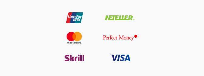 - WebMoney, Skrill, Perfect Money, Neteller, Wire transfer, Fasapay, Kartu bank, Online banking lokal, ChinaUnionPay